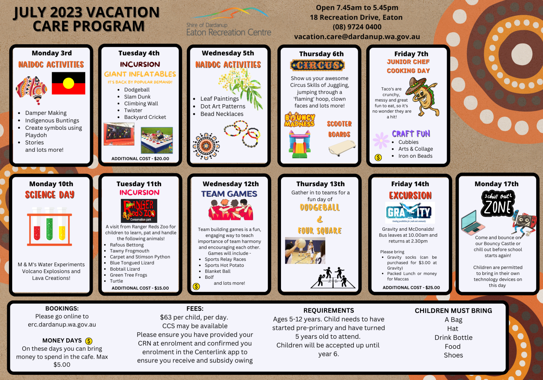 Check out the two weeks we have packed full of fun activities for the kids to stay active and entertained these July School Holidays. ERC Vacation Care - Bookings and more info Please note - Bookings will open on Monday 12th June at 1.00pm, any bookings made before this date and time will be removedNew families welcome!!